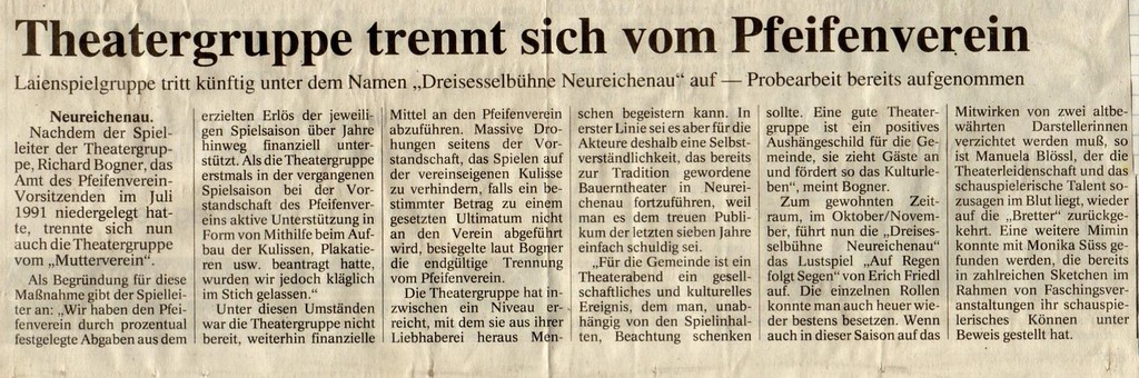Der damalige Vorstand des Pfeiffenvereins Richard Bogner konnte seine Vorstandschaft davon überzeugen, dass durch die Gründung einer Theatergruppe der Verein weit über den Gemeindebereich hinaus an Popularität gewinnen könne, eine kulturelle Lücke in Neureichenau geschlossen werde und gleichzeitig durch die Einnahmen die Vereinskasse aufgebessert werden könne.