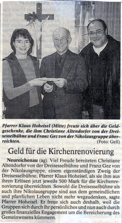 Als an alle Vereine der Gemeinde Neureichenau ein Spendenaufruf erging weil Pater Max Ascher aus Neureichenau in Japan lebt, haben wir uns entschlossen an Ihn 300 € für die Tsunamiopfer zu spenden. Von der Nikolausgilde einem Zweig der Dreisesselbühne wurden ebenfalls 300 € gespendet. Pater Max Ascher der seit 1963 für die Menschen in Japan seelsorgerisch da ist, ist ein Garant dafür, dass die Spenden genau dort ankommen, wo sie am Dringendsten gebraucht werden ohne das sie vorher von einem riesigen Apparat an Bürokratismus aufgebraucht werden.
