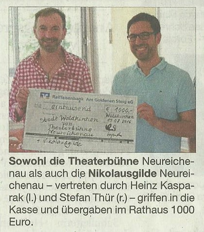 Ebenfalls 2016 spendete die Dreisesselbühne zusammen mit der Nikolausgilde 1000 € für die Flutopfer Waldkirchen