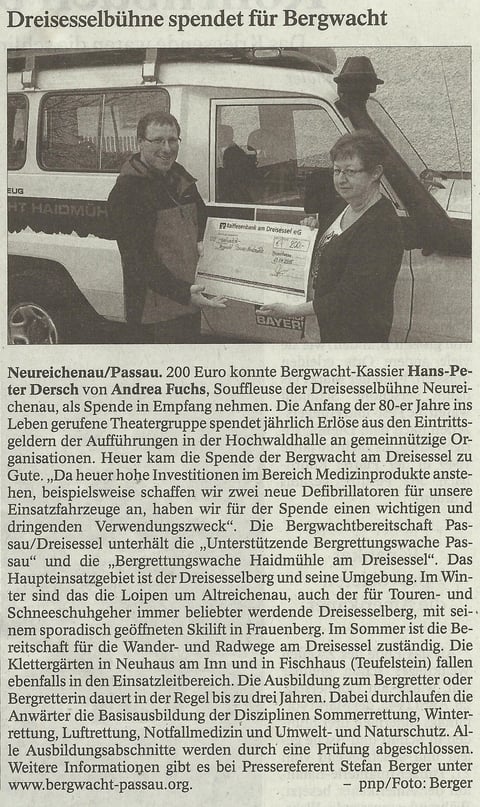 Ebenfalls 2015 spendet die Dreisesselbühne200 € an die Bergwacht